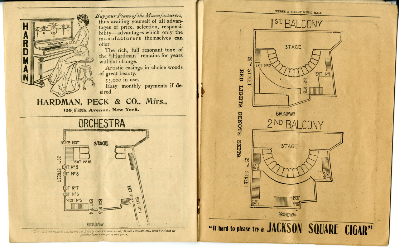 The Iroquois Theatre Fire led to the implementation many safety innovations in theatre construction, including doors with panic bars that opened in the direction of egress (two protections against the stampedes that took so many lives). These theatre programs, from the early 1920s, feature diagrams and instructions against panic: “Do not try to beat your neighbor to the street.”