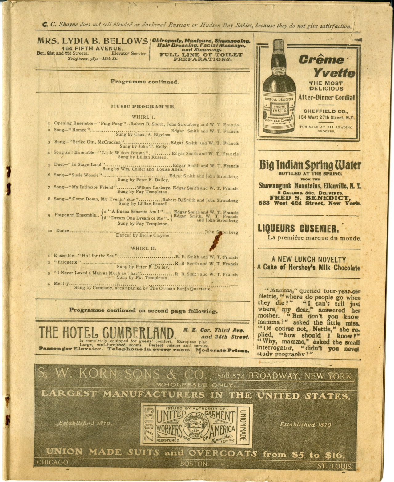 Older theatre programs can illuminate steps on theatre’s progression to a “respectable” entertainment form. This program from Weber and Fields’ Music Hall is from February 1903, for one of the last performances of their hit vaudeville show, Twirly-Whirly. This music hall program reflects a potentially “lower-brow” audience, not necessarily the “higher class” of patron Frank V. Strauss would later promise advertisers.