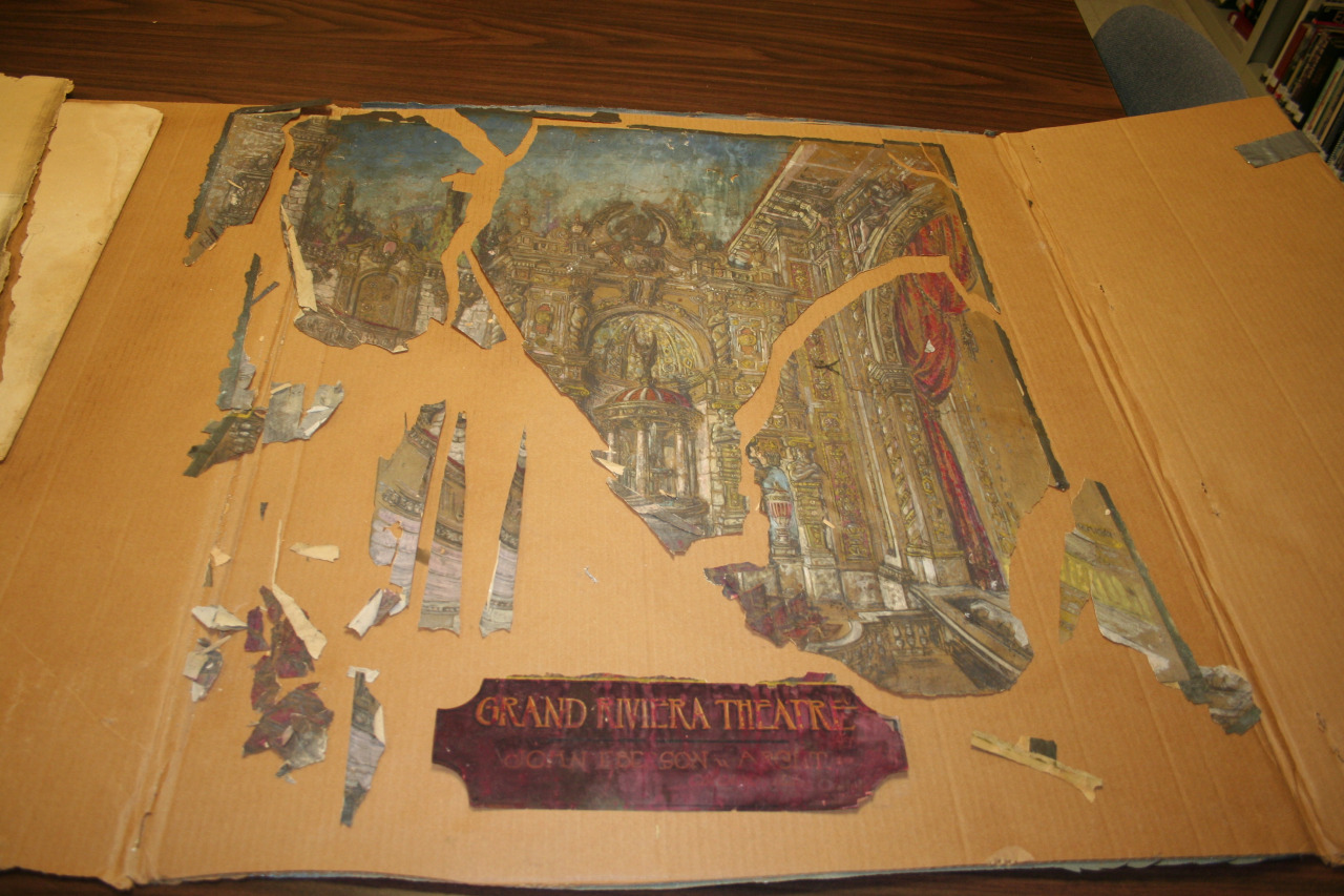 These photos show the before and afters of a recent preservation project. This large theatre rending has been in the collection for years, but due to the earlier lack of processing knowledge, there are no provenance records. We were able to bring the chipped jig-saw puzzle of a rendering to Chicago’s Graphic Conservation Company for professional paper preservation.