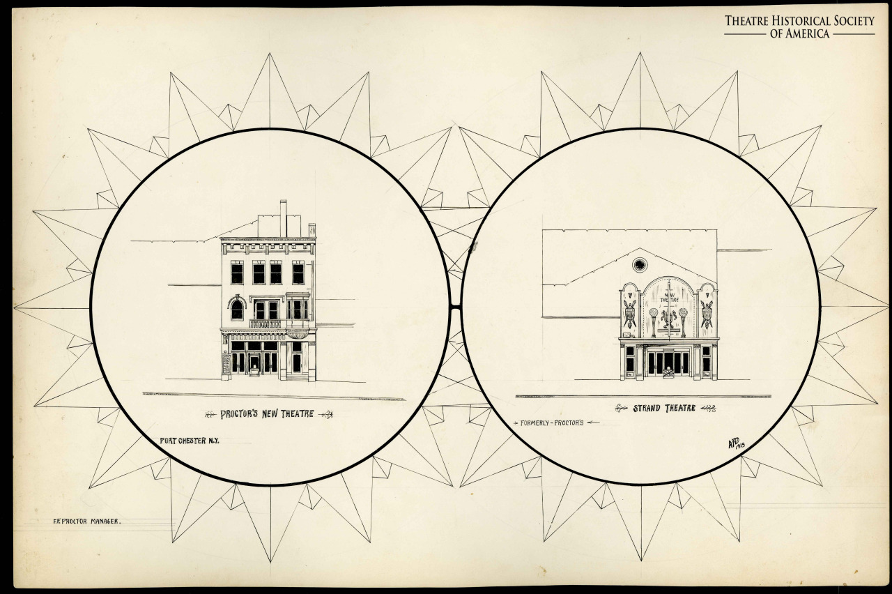 Some of the renderings, like this drawing of the Proctor’s New Theatre and Strand Theatre of Port Chester, NY feature whimsical ornamentation.