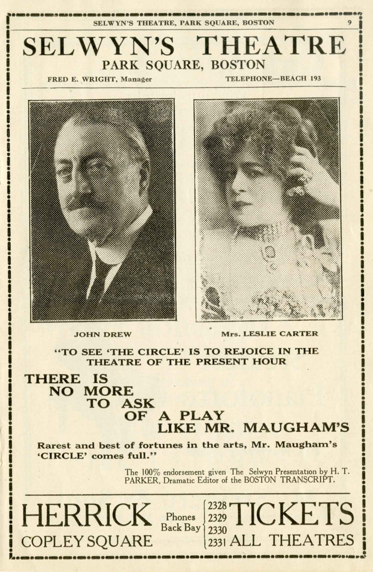 These pages from a 1921 program show exactly what one would expect- pictures of the stars, phone numbers for the ticket office, and praise for the performance. The Selwyn’s Park Square Theatre’s program for this performance of