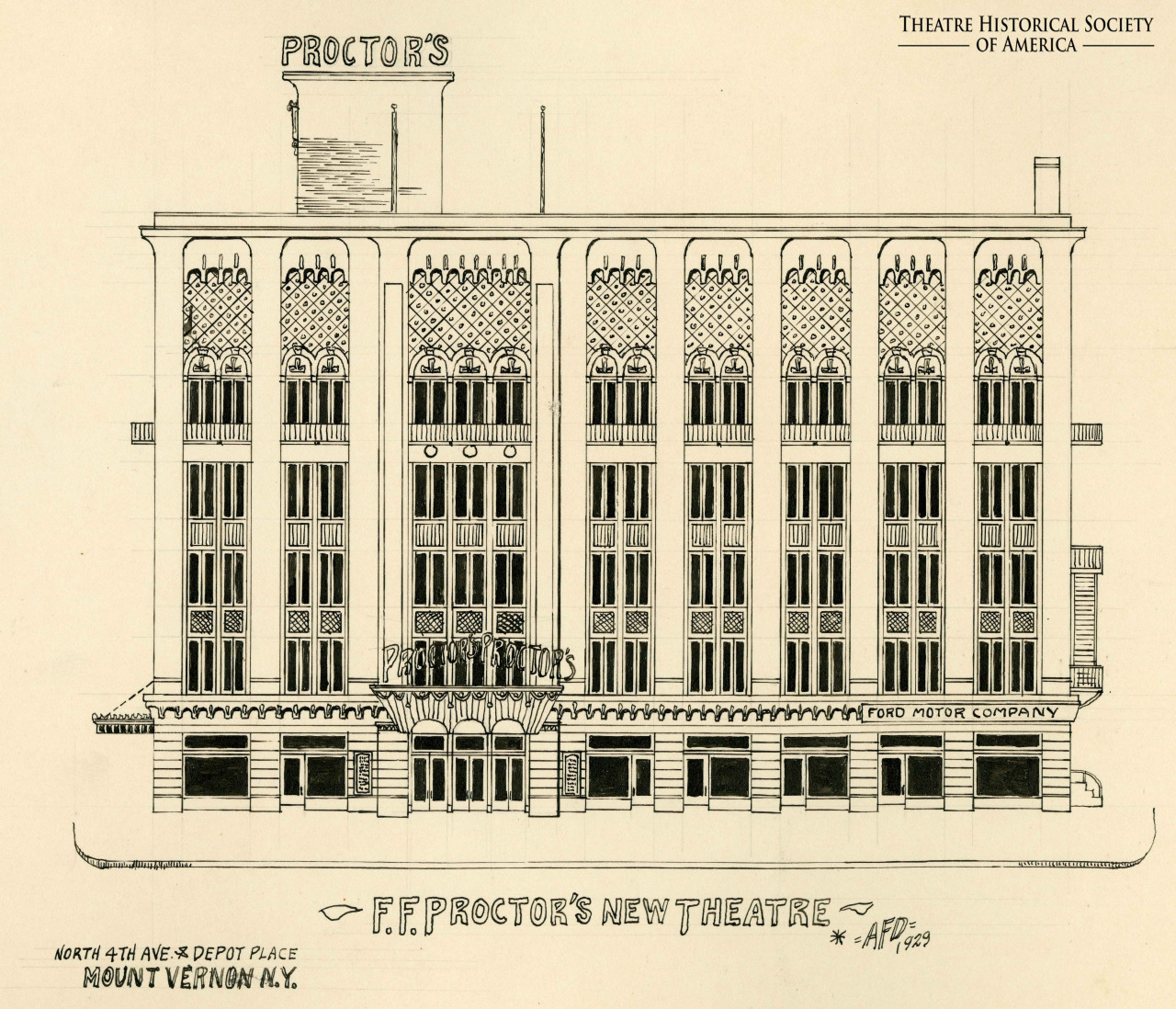 This is one of many F.F. Proctor’s New Theatres drawn by Anthony F. Dumas. These drawings illustrate (pardon the pun), another often forgotten but once common aspect of American theatres- the circuit. There was a time when it was not uncommon for regional businessmen to rise to great wealth through building and aquiring movie theatres spread across cities and towns.